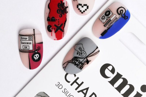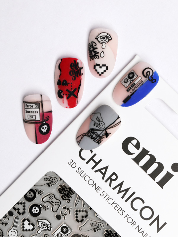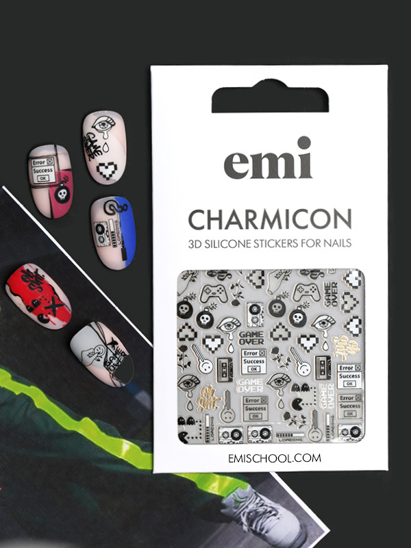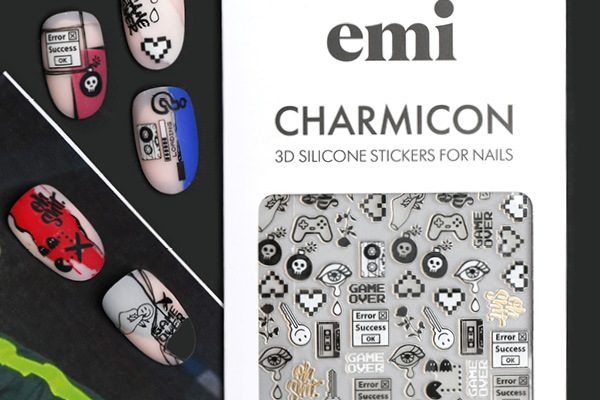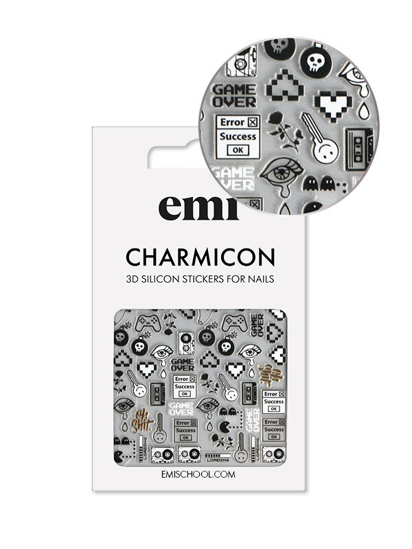 Charmicon 3D Silicone Stickers #188 Game Over – silikona uzlīmes Silikona uzlīmes – ļoti vienkārši pielietojumā – veido dizainus ar EMI! Noņem no pamata ar pinceti, līmē uz glancēta pamata bez lipīgā slāņa (var attaukot pamatu ar EMI Eurocleanser Lux vai pamatu pārklāt ar topu bez lipīgā slāņa E.MiLac Top gel Tackless),pielīmē kārtīgi uz naga, un visu nagu pārklāj ar topu.