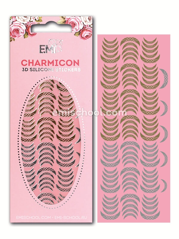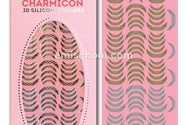 Charmicon 3D Silicone Stickers Modīgi. Ātri. Stilīgi • Modernu dizainu kolekcija. Dekoratīvo elementu izvēle jebkuram klientu pieprasījumam: lunulas, ķēdes, slēdzenes, rozes, kukaiņi, ornamenti, zvaigznes, uc. • Divi vienā. Uz vienas plāksnes atrodamas divas populārākās krāsas: zelts un sudrabs! • Lieliski rezultāti minūtes laikā. Charmicon 3D Silicone uzlīmes ir izgatavotas no smalka elestīga materiāla, padarot tos viegli pielāgojamus nagu formai. • Vienkārša lietošana. Lielisks risinājums ātram dizainam, atvieglo meistaram darbu un iepriecina klietu!