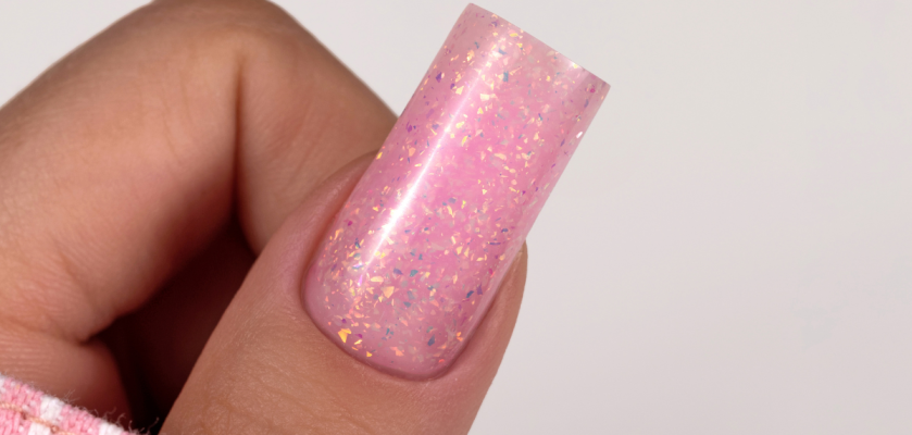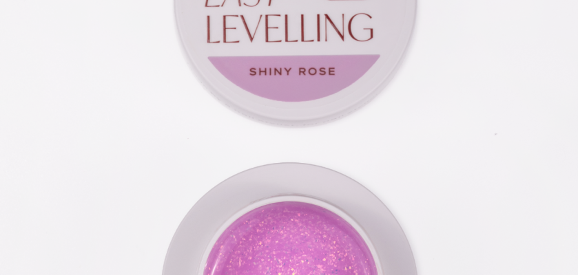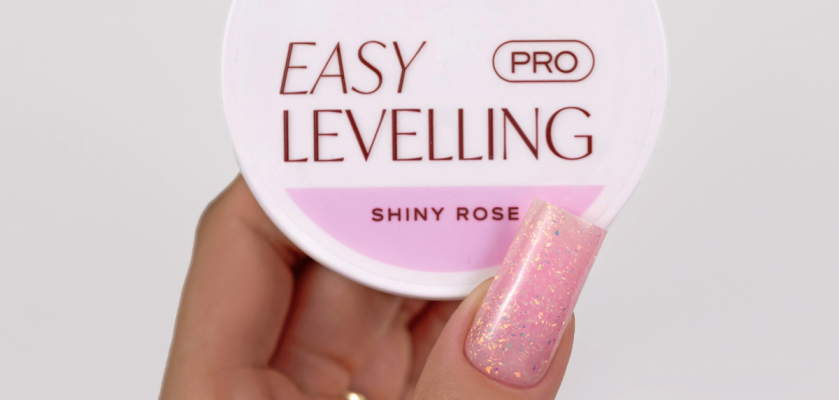 Easy Leveling PRO Shiny Rose ir daļēji caurspīdīgs rozā tonis, bagātināts ar opāla, neregulārām daļiņām, kas piešķir veidošanai trīsdimensiju efektu.